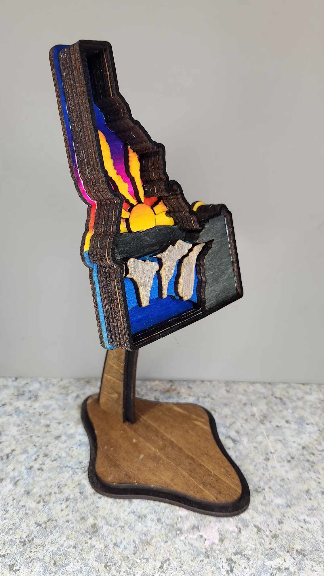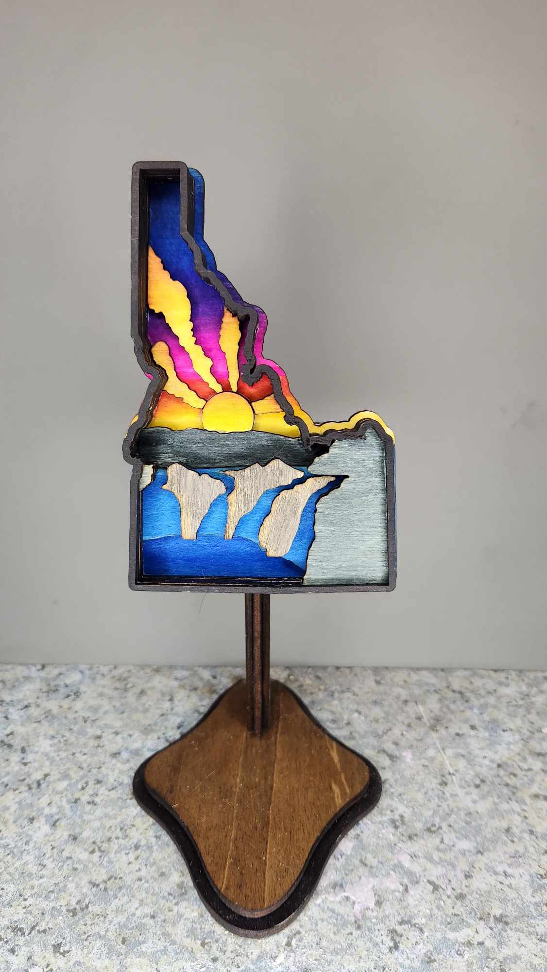 HDiscover the beauty of Idaho with our hand painted sign. Featuring the iconic Shoshone falls, this 6-layered sign adds depth and charm to any room. Each layer is carefully painted for a one-of-a-kind piece. Bring a piece of the Gem State into your home.